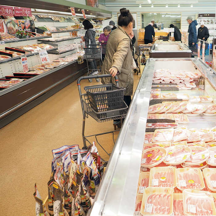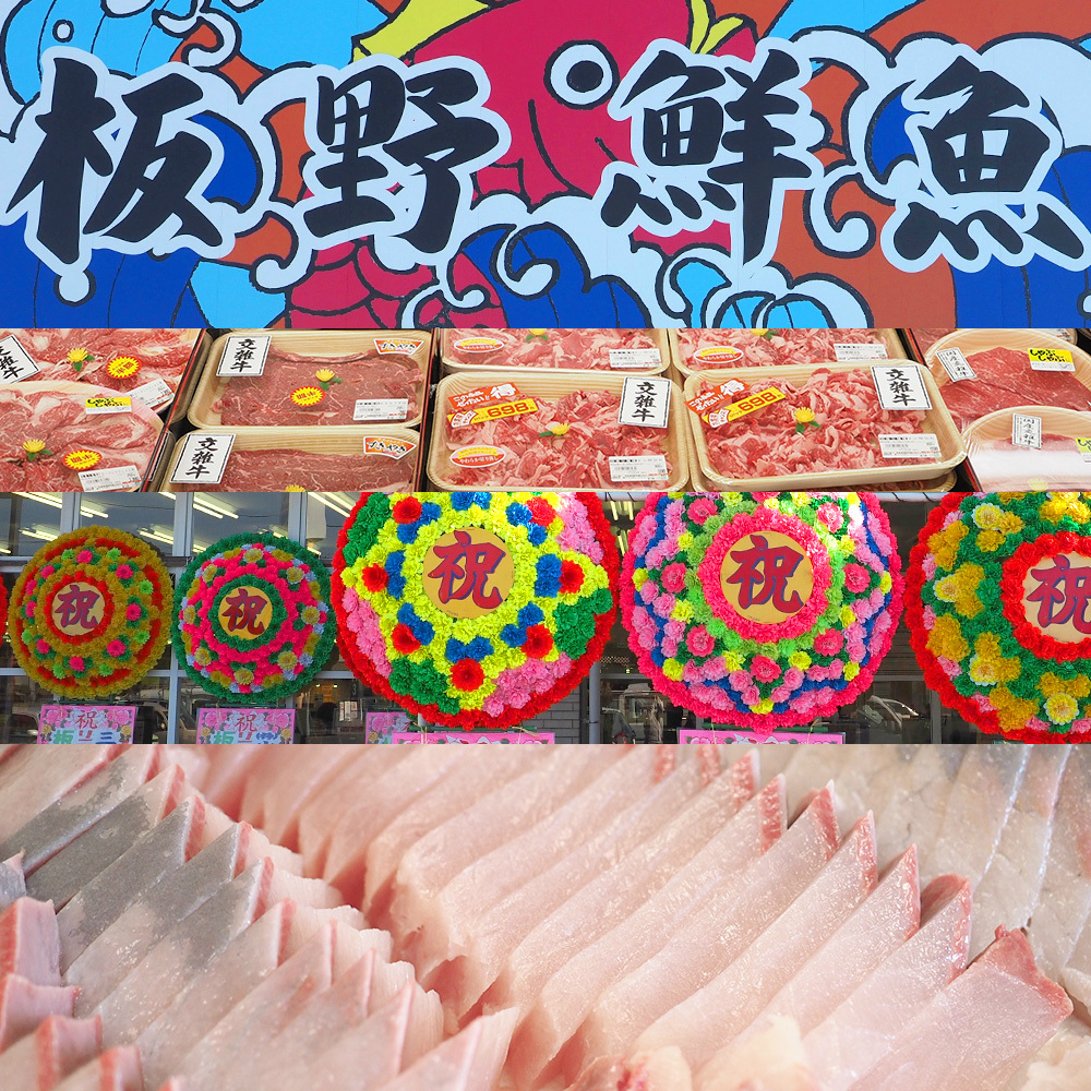 新鮮で、とびっきりおいしい旬の魚を味わっていただきたい! そんな思いから、入り口を入ってすぐ、お魚コーナーを設けました。私たち“板野鮮魚"では、地元産を中心に厳選した魚介類を豊富に取り扱っています。ぜひ、ご利用下さい。また元気の源、お肉!を選び抜いてご提供しています。安全で安心、そしておいしいママの店のお肉コーナーに足をお運びください。